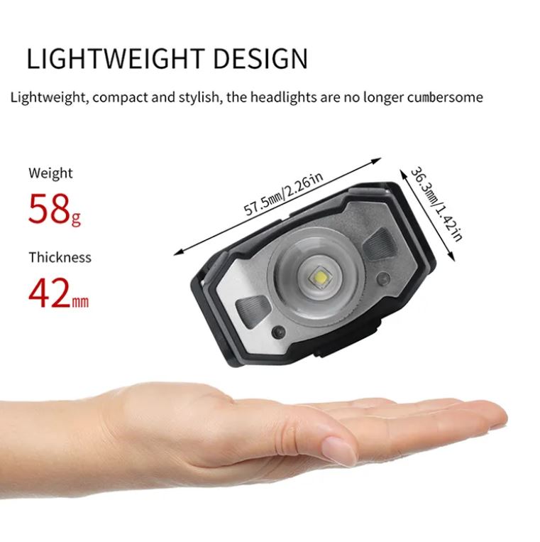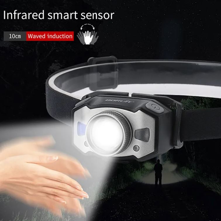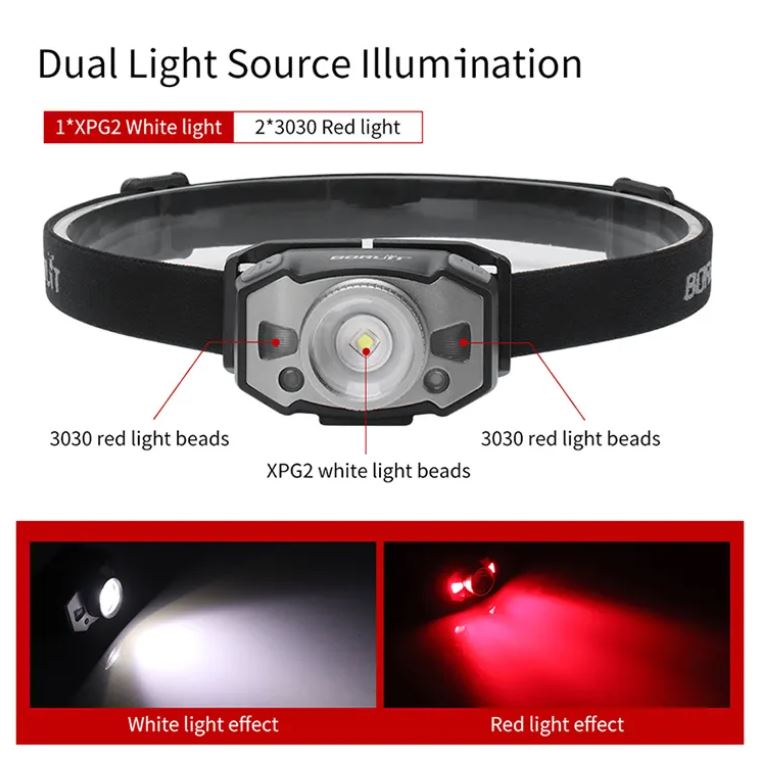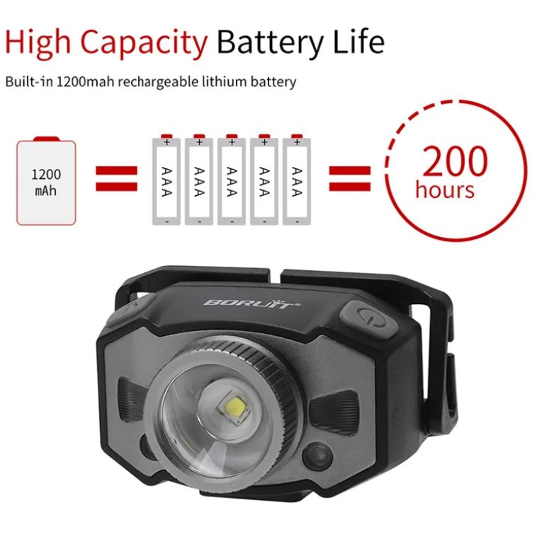 BORUiT 1200 lumens rechargeable LED headlamp with red light mode – perfect for night hunting. Preserves night vision, stealthy for game tracking, plus infrared sensor, zoomable lens, and IP44 water resistance. Lightweight 58g design with Type-C charging. Great for hunting, hiking, and camping.