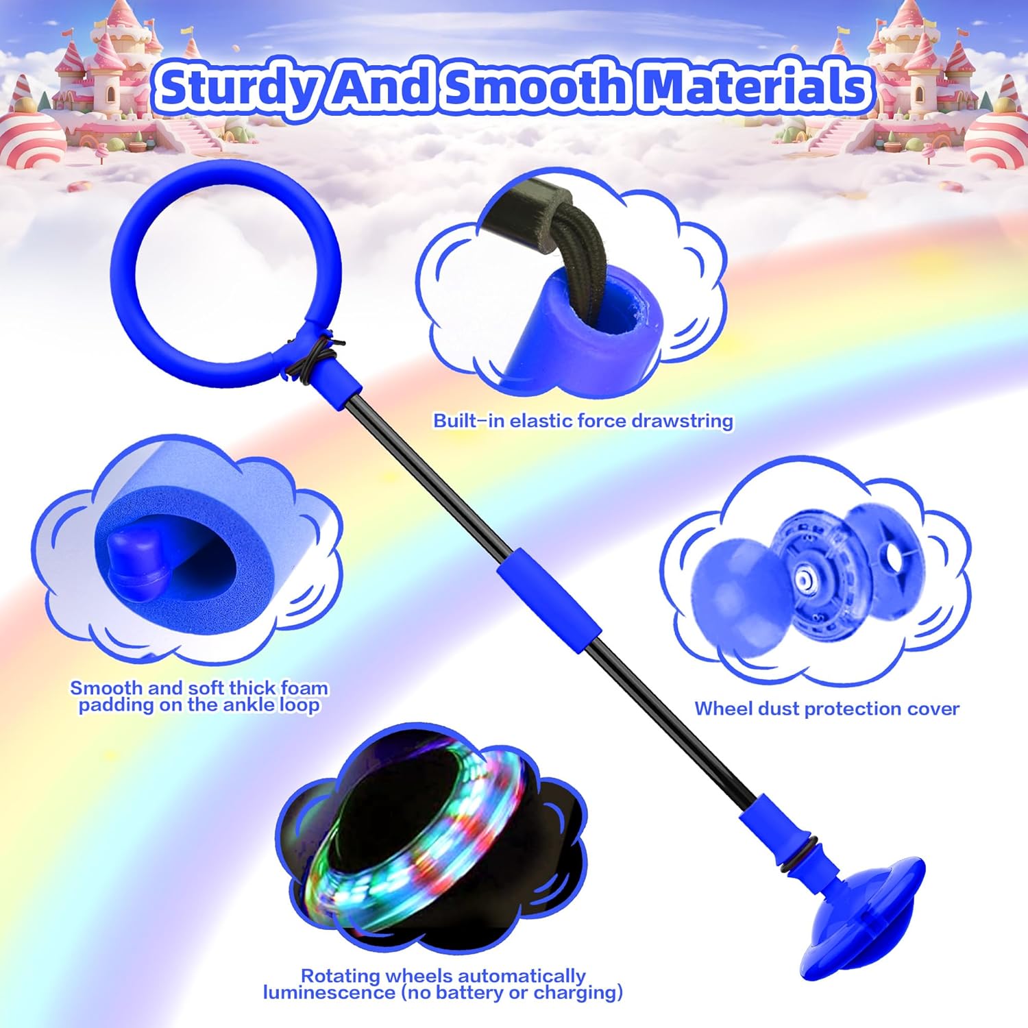- Flashing LED Wheel: Experience a mesmerizing light show without the need for batteries. Our Dynamo Skip-It Ball harnesses kinetic energy generated during spinning to produce colourful LED lights. This feature is especially captivating at night, making you stand out and providing endless entertainment.