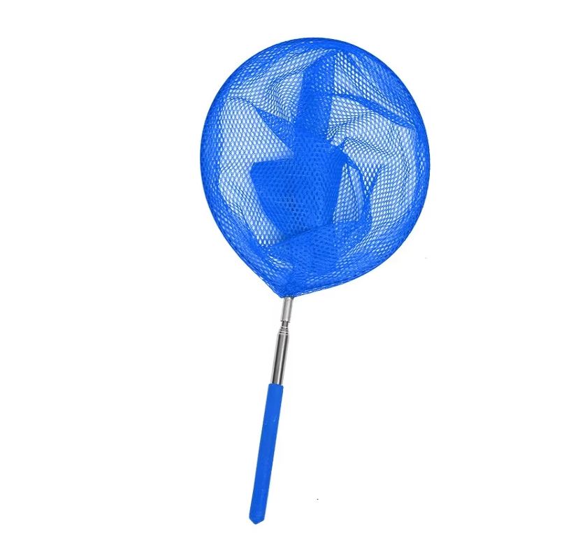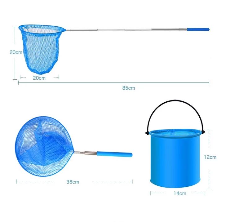 Kids Telescopic Fishing & Butterfly Net with Foldable Bucket – Extendable 36-85cm stainless steel handle, 20cm net, available in Blue, Green, Purple, Yellow. Perfect outdoor toy for insect catching, beach fishing, and nature exploration!