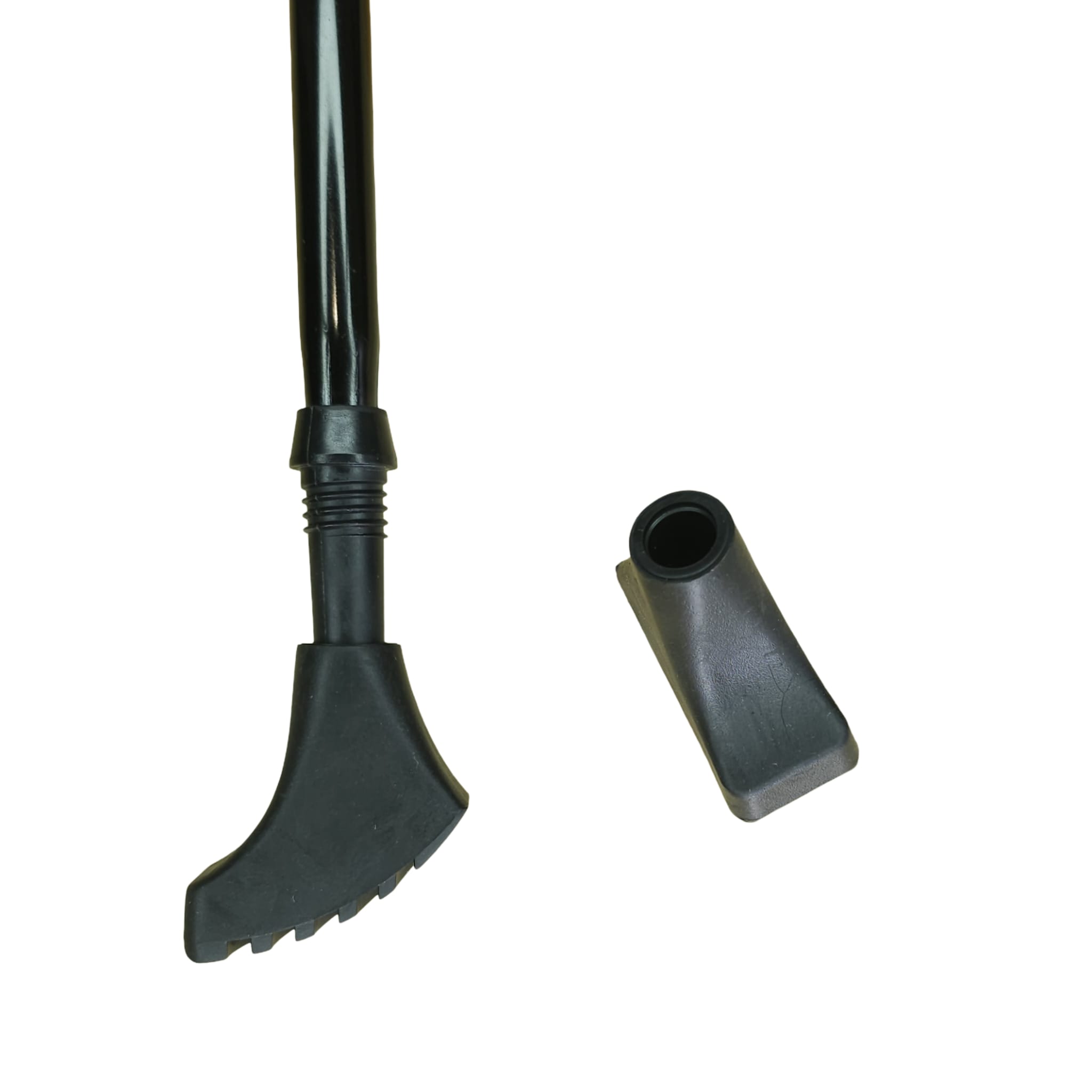 - Boot / Paw-Shaped Rubber Tip — Angled, boot-like profile with a flat or slightly curved tread pattern (often V-grooves for traction). Best for: Hard surfaces like asphalt, concrete, pavement, boardwalks, or urban Nordic walking. Maximizes surface contact for superior stability and traction on flat/hard ground; reduces vibration and noise while protecting pole tips from wear on rough man-made surfaces.