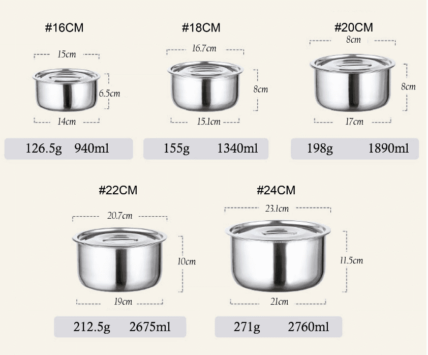 - #22cm: Diameter 20.7cm (top) / 19cm (base), Height 10cm, Capacity 2675ml, Weight 212.5g