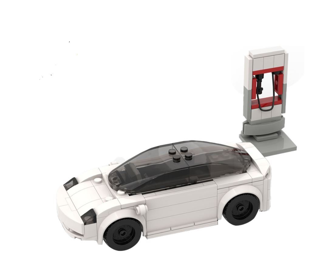 The set also includes a charging station accessory, creating a complete display scene that highlights the future of automotive design. Ideal for both building and showcasing, this model fits perfectly on desks, shelves, or as part of a collection.